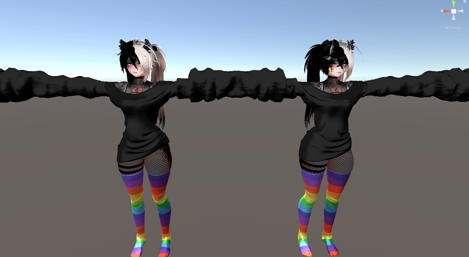 - Front and Back Hair Toggles; Pigtails + Long, Long, Pigtail 1 per side + Long, Short Fluffy Hair. Side Fluffs. Side Lengths Toggle. Default Bang, Thinner bang, Side bang. Skintone Radial. Greyscale Skin Radial. Split Hair Toggle. Hue/Saturation/Brightness Radials. HDR Toggle. Additional Emission Brightness/Hue/Saturation Sliders. Darker Tips Toggle. Rainbow Glitter Toggle. Multiple Color Styles for different design.