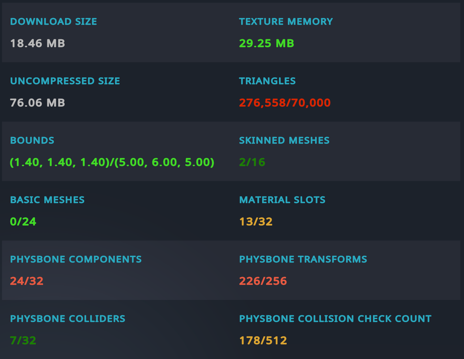 • Made with UV Tile Discard(Poiyomi feature) on ALL materials for optimization! Also made with Direct Blend Trees for animation optimization! Uses Memory Optimizer to condense parameters for way more features!